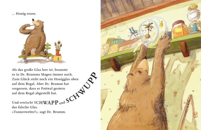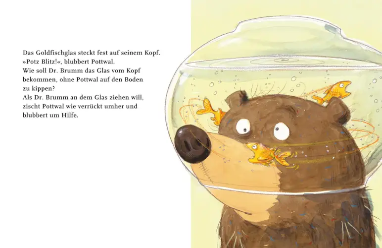 In „Dr. Brumm steckt fest“ von Daniel Napp erleben wir eine aberwitzige Kettenreaktion, wie sie nur Dr. Brumm passieren kann. Der liebenswerte Bär will an diesem Morgen eigentlich nur seinen Freund Pottwal – einen Goldfisch – begrüßen. Doch als er neugierig in dessen Glas schaut, geschieht das Unvermeidliche: Dr. Brumm bleibt mit dem Kopf im Glas stecken.