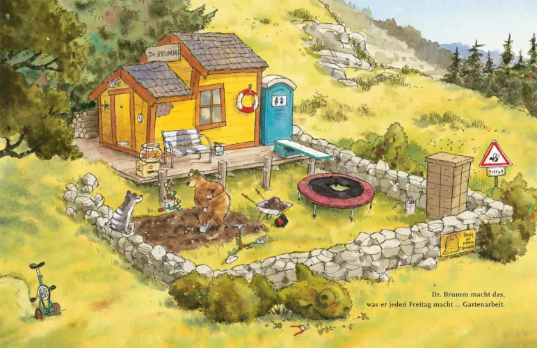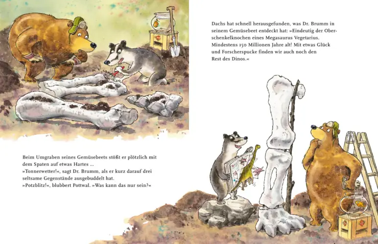 Es ist Freitag, also tut Dr. Brumm das, was er immer freitags tut: Er kümmert sich um seinen Garten. Doch als er beim Umgraben seines Gemüsebeets plötzlich auf etwas Hartes stößt, ist schnell klar – das ist kein gewöhnlicher Stein. Nein, es ist ein riesiger Dinoknochen! Gemeinsam mit seinen Freunden Dachs und Pottwal beginnt er zu graben – und fördert nach und nach ein komplettes Dinosaurierskelett zutage.