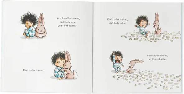 Ein kleiner, grauer Hase setzt sich einfach nur zu Charlie. Ohne große Worte, ohne Aktion – einfach nur da sein. Und plötzlich geschieht etwas: In der Stille entsteht Raum. Für Gefühle. Für Gedanken. Für Trost.